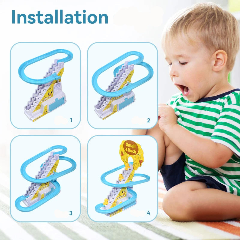🐥 Avec le Circuit des Petits Canards, les canetons montent tout seuls l’escalier, redescendent en glissant et repartent encore et encore… accompagnés de lumières colorées et de musiques joyeuses.